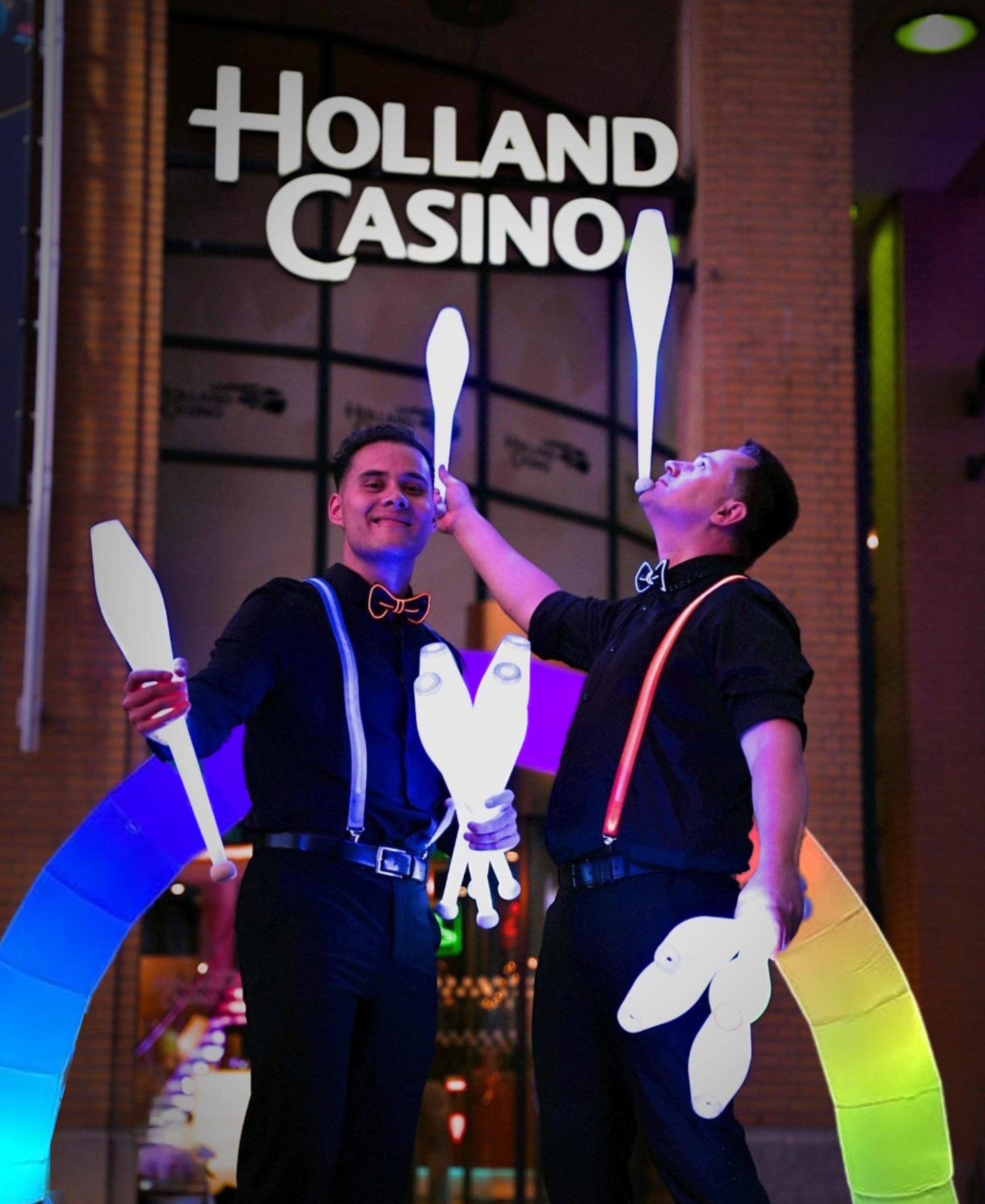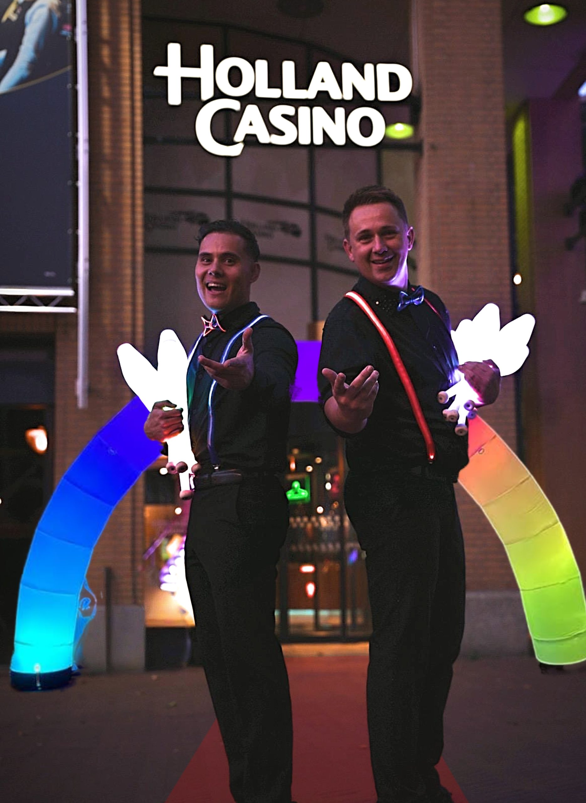 Je gasten arriveren en worden meteen spectaculair verwelkomd. Twee professionele jongleurs flankeren een rode loper terwijl ze lichtgevende kegels ritmisch door de lucht laten zweven. Elke gast wandelt door dit magische lichtspel en passeert onder een indrukwekkende LED-boog. Dit is een entree die direct sfeer, verwondering en gespreksstof oplevert.